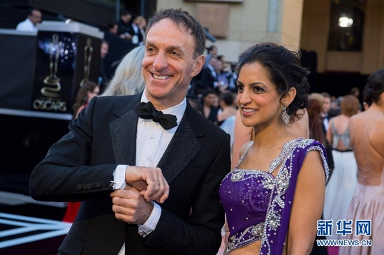 2月24日,在美國好萊塢舉行的第85屆奧斯卡獎頒獎典禮開始前,最佳原創(chuàng)音樂獎提名獲得者麥切爾·丹納(左)攜妻子阿帕爾娜亮相紅地毯。當天,第85屆在好萊塢舉行。