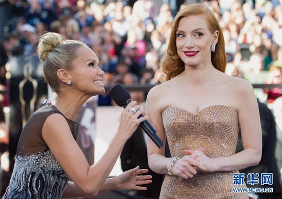 2月24日,在美國好萊塢舉行的第85屆奧斯卡獎頒獎典禮開始前,演員杰西卡·查斯坦(右)亮相紅地毯。當天,第85屆在好萊塢舉行。