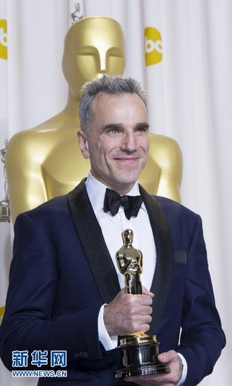 2月24日,在美國好萊塢杜比劇院,獲最佳男主角獎的演員丹尼爾·戴-劉易斯在后臺展示所獲獎杯。第85屆當天在美國洛杉磯好萊塢杜比劇院舉行。