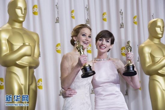 2月24日,在美國好萊塢杜比劇院,獲最佳女主角獎的詹妮弗·勞倫斯(左)和獲最佳女配角獎的安妮·海瑟薇在后臺合影。第85屆當天在美國洛杉磯好萊塢杜比劇院舉行。