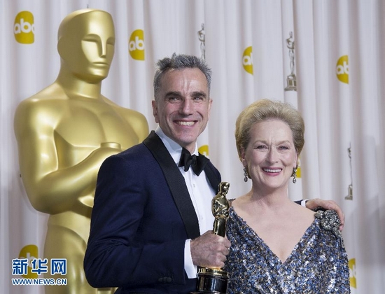 2月24日,在美國好萊塢杜比劇院,獲最佳男主角獎的演員丹尼爾·戴-劉易斯(左)和美國著名電影演員梅里爾·斯特里普在后臺合影。第85屆當天在美國洛杉磯好萊塢杜比劇院舉行。