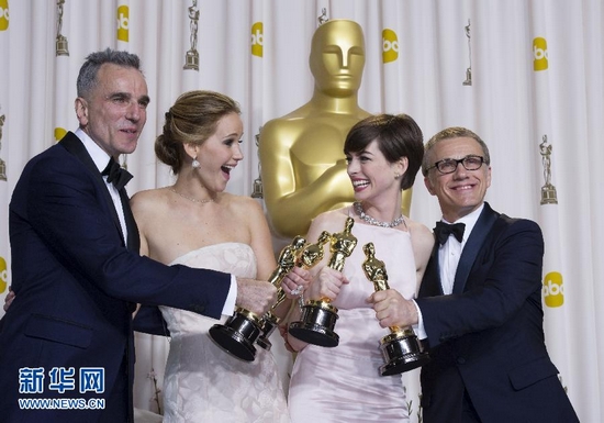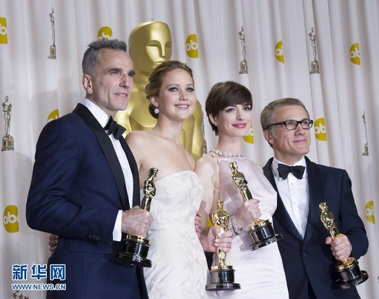 2月24日,在美國好萊塢杜比劇院,獲最佳男主角獎的丹尼爾·戴-劉易斯、獲最佳女主角獎的詹妮弗·勞倫斯、獲最佳女配角獎的安妮·海瑟薇及獲最佳男配角獎的克里斯托弗·華爾茲(從左至右)在后臺合影。第85屆當天在美國洛杉磯好萊塢杜比劇院舉行。