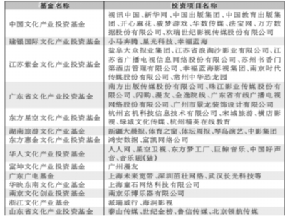 在大多數(shù)文化產(chǎn)業(yè)投資基金為選擇哪些項目進行投資猶豫之時,已有不少投資基金進行了有益嘗試。它們并未將眼光局限在即將上市的成熟企業(yè)中,而是緊跟文化產(chǎn)業(yè)的發(fā)展脈絡(luò),找到了合適的投資項目。這些文化產(chǎn)業(yè)投資基金的介入,為處于小而散發(fā)展態(tài)勢的文化企業(yè)解決了資金短缺問題,為它們的發(fā)展注入了新鮮“血液”。