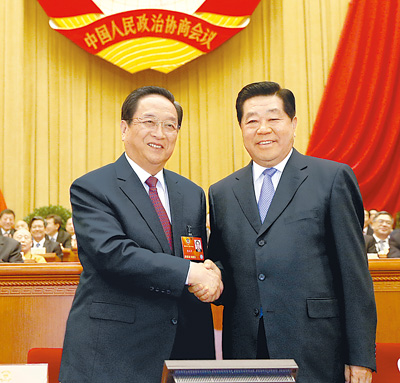 3月11日,全國政協十二屆一次會議在北京人民大會堂舉行第四次全體會議,俞正聲當選政協第十二屆全國委員會主席。這是政協第十一屆全國委員會主席賈慶林和俞正聲親切握手,表示祝賀。 新華社記者 鞠 鵬攝