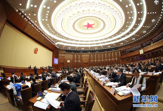 3月12日,十二屆全國人大一次會議主席團在北京人民大會堂舉行第三次會議。主席團常務主席張德江主持會議。 (新華社記者 蘭紅光 攝)