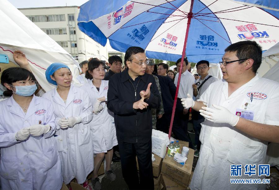 4月20日,中共中央政治局常委、國務院總理李克強抵達四川蘆山地震災區察看災情,部署抗震救災工作。這是李克強在蘆山縣醫院向醫護人員詢問受傷群眾救治情況。新華社記者 黃敬文 攝