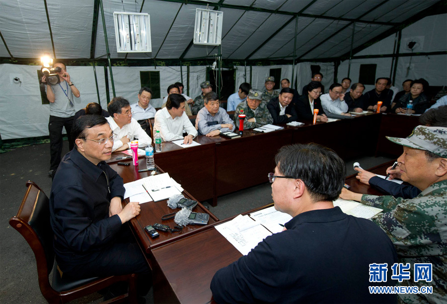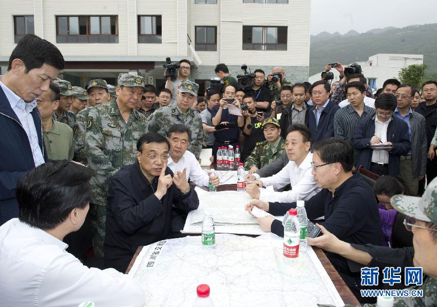 4月20日,中共中央政治局常委、國務院總理李克強抵達四川蘆山地震災區察看災情,部署抗震救災工作。這是李克強在受災嚴重的龍門鄉召開現場會。新華社記者 黃敬文 攝