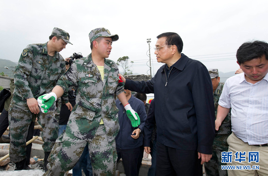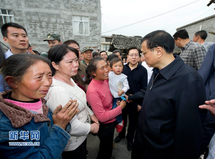 4月20日,中共中央政治局常委、國務院總理李克強抵達四川蘆山地震災區察看災情,部署抗震救災工作。這是李克強在災情嚴重的雙石鎮看望受災群眾。新華社記者 黃敬文 攝