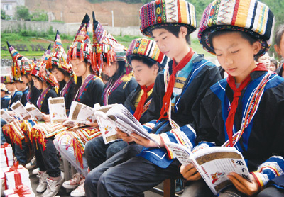 4月23日,廣西賀州市開展“紀念‘世界讀書日’國學經典進瑤山”活動。圖為賀州市黃洞瑤族鄉民族學校的瑤族學生在誦讀國學經典《弟子規》。廖祖平攝(新華社發)