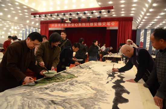 張道興、苗重安、于志學(xué)、謝志高、何家英、史國良、苗再新、鄒立穎、劉進安……4月25日,60余位在京著名美術(shù)家與中國美協(xié)分黨組成員、中國美協(xié)各部室負責(zé)人匯聚一堂,參加中國美協(xié)舉辦的心系四川雅安賑災(zāi)筆會。凝聚著現(xiàn)場創(chuàng)作者深情的十張丈二人物、山水、花鳥合作作品,以及馮遠、楊力舟、王迎春等眾多美術(shù)家捐贈的作品,將由中國美協(xié)組織義賣,所籌款項將用于災(zāi)后重建工作。這也是繼中國美協(xié)在第一時間向雅安地震受災(zāi)地區(qū)捐款200萬元后,又一項為災(zāi)區(qū)所做的善舉。