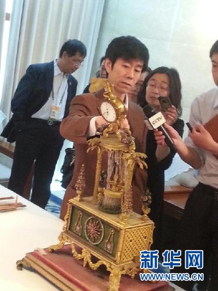 5月5日,故宮博物院宮廷部研究員郭福祥向記者介紹清代銅鍍金轉花水法人打鐘受損情況。 新華社記者 廖翊 攝