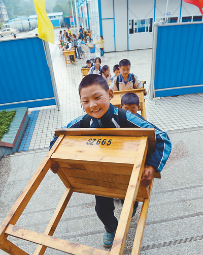 五月二十四日,四川省蘆山地震一個多月后,雅安市雨城區(qū)上里鎮(zhèn)中心學(xué)校的學(xué)生將課桌搬進(jìn)加固后的綜合樓。