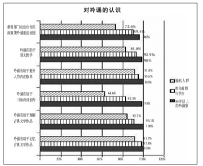 據課題組調查訪問數據統計顯示,三個群體中認為“吟誦有助于記憶古典文學作品”的比例分別高達100%、97.8%、91.7%,而認為“吟誦有助于理解古典文學作品”的比例各為100%、90.1%、83.7%,認為“吟誦有助于舊體詩詞創作”的比例各占98%、82.3%、61.6%,認為“吟誦有助于提升人的內在修養”的比例分別高達100%、95.6%、91.8%,認為“吟誦有助于語文教學”的比例各為98%、92.9%、81.8%,認為“教育部門應出臺相關政策使吟誦重返校園”的比例各占96%、89.4%、72.6%。這一連串的數據告訴我們,普通民眾對于吟誦在育人、修身等方面的重要作用都有樸素正確的認識,對其重返校園,重回我們身邊并發揮固有的文化潛力有著熱切的期盼。