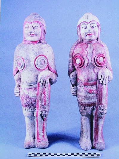 日前,山西太原開化墓群考古發掘取得重大收獲,考古隊在開化墓群發現了大量漢、北齊、明清時期墓葬,其中,發掘出的一處漢代磚室墓葬規模之宏大、結構之復雜,在山西實屬罕見。在3座北齊墓中出土了135件色澤鮮艷的陶俑,尤其是在北齊楚州刺使趙信夫婦合葬墓中出土的一組鎮墓武士釉彩陶俑,高50厘米,全身間以紅白彩繪,上戴頭盔,持戟摯盾,體態健碩,眉目和善,足可與婁睿墓武士俑相媲美。