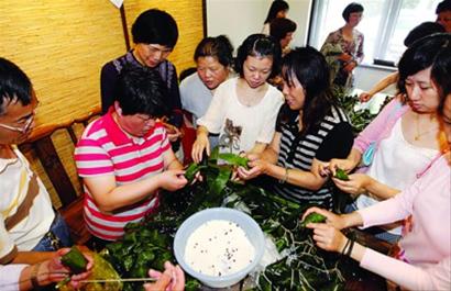 圖說:漕東支路社區昨天舉辦“培訓班”,教年輕人如何包粽子。解放日報 張海峰 攝
