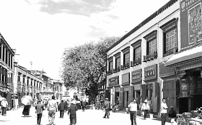 拉薩老城區居民漫步在經過改造的著名轉經道“八廓街”上。資料圖片