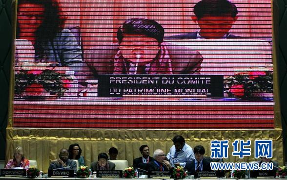 6月21日,在柬埔寨首都金邊,柬埔寨副首相索安(前排左三)主持世界遺產(chǎn)大會(huì)。當(dāng)日,世界遺產(chǎn)大會(huì)組委會(huì)討論來自全球27個(gè)國家和地區(qū)的31處遺產(chǎn)申請(qǐng),并表決是否列入聯(lián)合國教科文組織《世界遺產(chǎn)名錄》。來自中國的新疆天山成功進(jìn)入世界遺產(chǎn)名錄。新華社記者李瑩攝