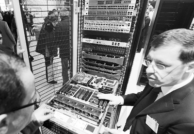 2013年3月德國漢諾威IT展戴爾公司展臺,工作人員向參觀者介紹大型服務器。新華社發