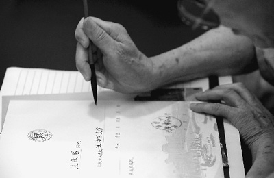 老人用毛筆寫著通知書,每一筆都小心謹慎 董國梁攝(人民視覺)