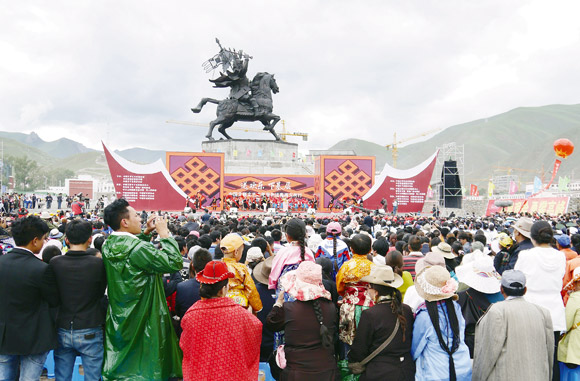 7月15日至16日,中國文聯(lián)文藝志愿服務(wù)團赴青海玉樹開展“送歡樂、下基層”慰問活動。圖為高聳著格薩爾王塑像的廣場演出現(xiàn)場。中國藝術(shù)報記者 郭青劍 攝