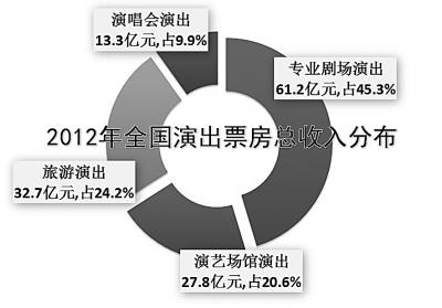 統(tǒng)計(jì)顯示,2012年全國(guó)演出經(jīng)紀(jì)機(jī)構(gòu)各項(xiàng)收入總計(jì)79.1億元,其中劇場(chǎng)售票演出收入48.83億元,企業(yè)包場(chǎng)或參與企業(yè)年會(huì)等活動(dòng)收入9.83億元,提供中介服務(wù)收入3.37億元,藝人代言、廣告等收入約17億元。