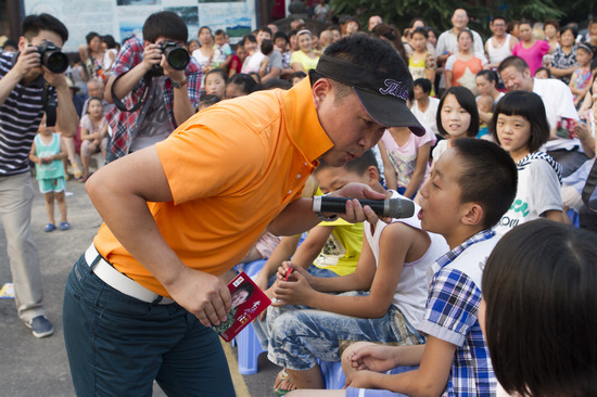 距演出開始還有很長一段時間,當地群眾就從四面八方匯集于此,眼神里滿是期待與盼望。在《劉鄧和他們的朋友們》的雕像前,遠道而來的藝術家們與觀眾開始了聯歡。京劇表演藝術家于蘭在演出前一天腳趾受傷化膿,為了演出效果,她匆匆抹了藥膏踩上高跟鞋穿著呢子軍裝就頂著烈日為老鄉們開始表演,京劇《家住安源》《霸王別姬》選段唱腔依舊韻味濃郁,引來叫好聲不斷。70歲的著名魔術表演藝術家羅秉松帶著墨鏡穿著黑色西服幽默登場,他的魔術讓老鄉們極為過癮。羅秉松邀請現場觀眾與他一道演出。面對初次上臺有點緊張的兩個女孩,羅秉松趕緊安慰說:“你們和我的女兒一樣大,不要緊張,來,我教給你怎樣演。你拿著繩這樣打一個結……”在他的示范下,女孩們很快就掌握了表演技巧,臉上滿是笑容。歌手金波的一曲《有事你就說》引發臺上臺下集體大合唱,他走下臺拿出最新的專輯發給坐在第一排的小朋友,小朋友捧著專輯笑了,黝黑的小臉露出潔白的牙齒。“節目真好看”、“演出太棒了”……老鄉們深深地被精彩的節目迷住了,他們熱烈地拍著雙手叫著好,以質樸的語言和行動表達著對藝術家們以后能夠再次來演出的希冀。在近40度的高溫下,臺上的藝術家和臺下的老區人民熱情高漲,現場融匯成一片歡樂的海洋。