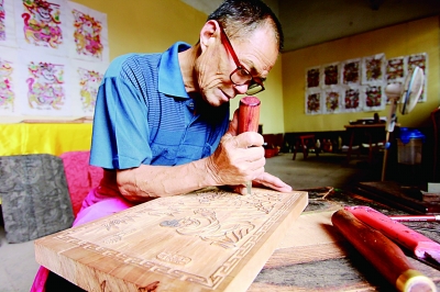 周口年畫傳承人夏明月在雕刻木版年畫模板。 CFP