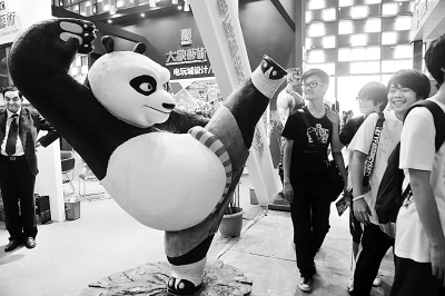 第九屆中國國際動漫游戲博覽會上,幾名參觀者從功夫熊貓模型前走過。新華社發