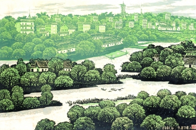 春風(fēng)吹綠客家村 2001年 61×93cm 油印套色木刻 中國美術(shù)館藏