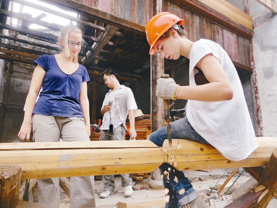 8月21日,一名法國志愿者在使用蘇州木匠的傳統工具給木條開槽。當日,來自中法兩國的志愿者在江蘇蘇州平江路歷史街區,一同參與古建筑的修復工作。這些志愿者來自第三屆中法文化遺產保護志愿者工作營,由9名法國志愿者和9名中國志愿者組成。他們在平江路上共同學習蘇州傳統建筑工藝,一起參與平江路傳統建筑的修復工作,親身體驗傳統建筑工藝的魅力。新華社發 王建康 攝