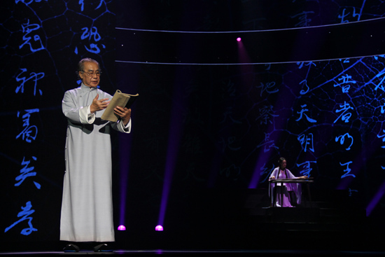 “夫孝,天之經(jīng)也,地之義也,民之行也。”“夫孝,德之本也,教之所由生也。”……藍底白字、跌宕遒勁的《孝經(jīng)》書法背景的舞臺側(cè)畔,依稀現(xiàn)出一清麗女子輕撥古琴;而另一端,身著一襲長袍,手持泛黃簡書,著名播音藝術家方明傾情朗誦《孝經(jīng)·三才章》《孝經(jīng)·開宗明義章》原文,以此為上下篇開篇。頓挫鏗鏘、深沉厚重的吟誦,句句叩擊心靈,也內(nèi)在統(tǒng)貫著整個詠誦會。