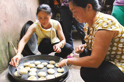 村里的婦女們試著做月餅出售。