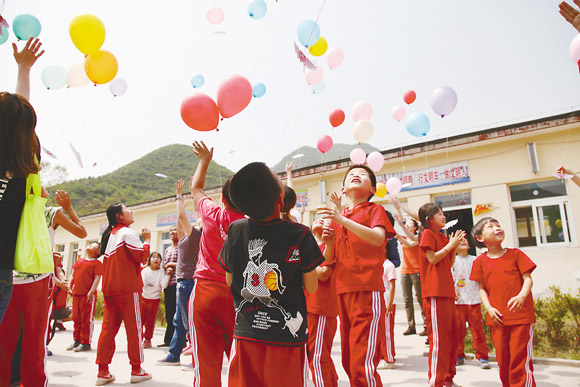 2013年5月22日,《想飛的孩子》主創團隊與昌平區老峪溝中心小學的孩子們共同放飛載有夢想卡片的氣球