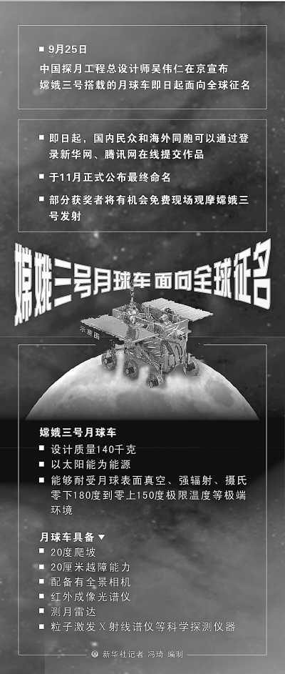 嫦娥三號探測器預計將于今年12月發射,其承擔月面巡視探測任務的中國第一輛月球車(月球巡視探測器)同樣備受矚目。這輛月球車究竟是什么樣?它將怎么進行它的“探月之旅”?又會完成哪些科學任務?25日,在北京舉行的嫦娥三號月球車全球征名活動上,這些問題一一得到解答。