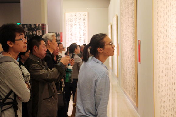 9月28日至10月9日,由中國文聯(lián)立項,中國書協(xié)主辦,中國文學(xué)藝術(shù)基金會資助的以“名篇、名家、名作”為主題的成果匯報展——首屆全國“三名工程”書法展在中國美術(shù)館與廣大觀眾見面。圖為嘉賓參觀展覽。范秋晗 攝