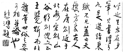 徐悲鴻對(duì)王學(xué)仲說:“‘怪’字的含義有貶也有褒,‘揚(yáng)州八怪’不也是‘怪’嗎?你的書畫有一些文人畫的趣味,但還要下深功夫,形成你個(gè)人的風(fēng)貌?!毙毂檽]毫勉勵(lì)他:“呼延生方在少年,其書得有如是造詣,秉(稟)賦不凡,蓋由天授,方之古人,在唐則近于北海,宋則山谷,明則倪文正、王覺斯,而非趙、董世俗之姿可相并論也?!?/p>
