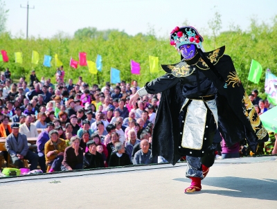 十月十一日,河北省河間市景和鎮(zhèn)石灰屯村的村民欣賞川劇《變臉》時發(fā)出歡快的笑聲。當(dāng)日,北京市意馨明輝國際文化藝術(shù)發(fā)展有限公司藝術(shù)團(tuán)二百多名演職人員將一臺文化大戲送到了該村,受到了村民的熱烈歡迎。