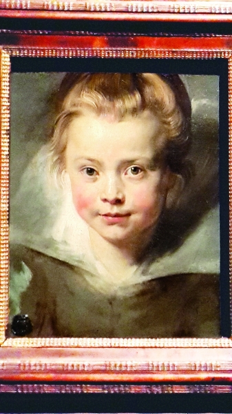 展廳里有一幅只有B4紙那么大的油畫,卻“吸”住了每一位從它面前走過的觀眾——這就是《克拉拉·賽琳娜·魯本斯的肖像》,歐洲藝術史上最動人的一幅肖像畫。這件作品是魯本斯1616年創作的,描繪的是他5歲的長女克拉拉·賽琳娜。在白色衣領的襯托下,女孩兒臉頰粉紅,綠色的大眼睛率真地盯著畫面之外,那張寫滿稚嫩、天真無邪、討人喜愛的臉龐栩栩如生,而濃濃的父愛也在每一筆線條、每一塊色彩中蕩漾,打動每一位觀者。