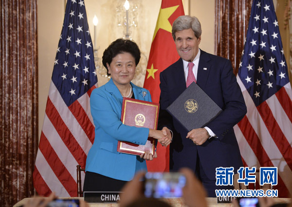 11月21日,在美國首都華盛頓,中國國務院副總理劉延東(左)與美國國務卿約翰·克里共同主持第四輪中美人文交流高層磋商全體會議,并代表兩國政府續簽《關于中美人文交流高層磋商機制的諒解備忘錄》。為繼續做好中美雙邊合作,并落實兩國領導人6月安納伯格莊園會晤的重要共識,中美兩國政府于21日在華盛頓舉行了第四輪中美人文交流高層磋商。中國國家主席習近平和美國總統奧巴馬分別發來賀信。今年磋商的主題是“青年與創新”。新華社記者張軍攝