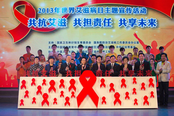 人民網(wǎng)北京11月30日電 今年12月1日是第26個“世界艾滋病日”, 11月30日,由中國健康教育中心、中國性病艾滋病防治協(xié)會、中華紅絲帶基金共同主辦的2013年世界艾滋病日主題宣傳活動在京舉行。WHO艾滋病/結(jié)核病防治親善大使、國家衛(wèi)生計生委預(yù)防艾滋病宣傳員彭麗媛等公益人士參與了宣傳活動。