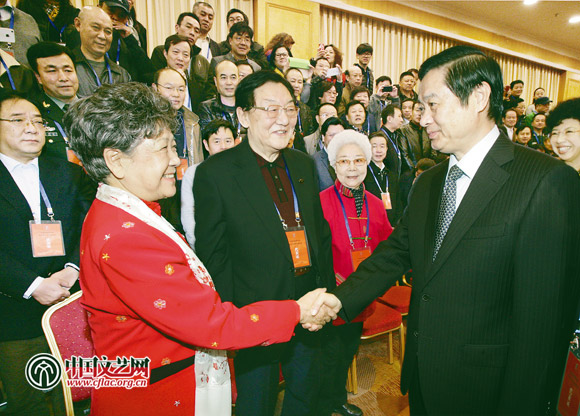 11月29日,中國電影家協會第九次全國代表大會在京開幕。中共中央政治局委員、中央書記處書記、中宣部部長劉奇葆(右)親切接見與會代表。中國藝術記者 孟祥寧 攝