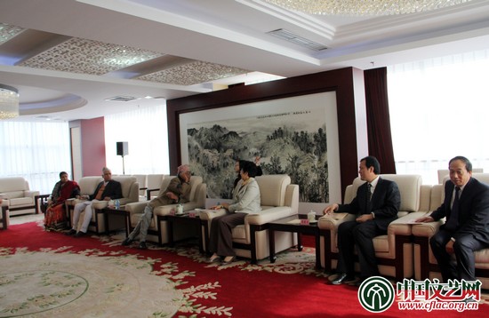 趙實代表中國文聯對代表團的來訪表示歡迎,并簡要介紹了中國文聯的基本情況及中國文聯和各全國文藝家協會近年來與尼泊爾進行文化交流的情況。她說,中國文聯一向重視發展與尼泊爾文藝界的交流合作。自20世紀80年代,中國文聯與當時的尼泊爾皇家學院開始往來,直至本世紀初,雙方互派代表團訪問,一直保持良好的交往關系。此次尼泊爾學院代表團訪華,將進一步增進中尼兩國文藝家之間的交流和友誼。她建議,在2014年適當時候,中國文聯組派代表團對尼泊爾進行回訪,與尼方續簽《合作備忘錄》 ;定期組派兩國文藝家,特別是青年文藝家互訪;雙方在藝術教育、藝術培訓等方面開展合作;促進各自出版的文藝刊物進行交換。
