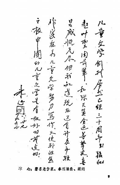 著名作家,《兒童文學》編委、顧問冰心為《兒童文學》創刊30周年題詞