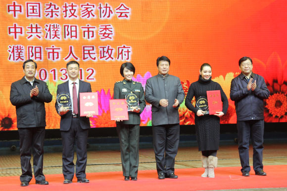 12月27日,第八屆中國雜技金菊獎第三次劇目獎頒獎儀式在河南濮陽舉行。圖為與會領導給獲獎單位頒發證書。中國文藝網 何瑞涓 攝