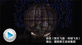 “咿——呀——”第一個節目《俏花旦·集體空竹》先聲奪人,11個俏麗的花旦輕盈上場,空竹抖起,拋向空中,翻身跳躍,再一側身,將空竹穩穩接住,姿態優美,像燕子,像蝴蝶,又像精靈。這個節目將傳統與時尚巧妙融合,曾在2007年央視春晚觀眾最喜愛的節目中獲得一等獎,并獲第37屆摩納哥蒙特卡羅國際馬戲節“金小丑”獎、第26屆法國國際雜技最高獎“法蘭西共和國總統獎”等多項殊榮。火辣的探戈舞串場之后,一個龐大的滾動的軸輪出現在臺上。只見背景屏幕中忽而海浪翻滾,陰云密布,忽而風平浪靜,晚霞映天,一黑一白兩人在海上巨輪中疾走跳躍,好似天與地、生與死不斷輪回。《天地輪回·生死輪》是河南濮陽雜技劇《水秀》片段,《水秀》剛剛在第八屆中國雜技金菊獎第三次劇目獎中獲得優秀劇目獎。