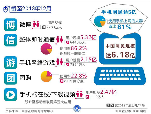 中國互聯(lián)網(wǎng)絡(luò)信息中心16日發(fā)布數(shù)據(jù)顯示,截至2013年12月,中國網(wǎng)民規(guī)模達6.18億。其中,網(wǎng)民中使用手機上網(wǎng)的人群占比由2012年底的74.5%提升至81.0%,手機網(wǎng)民規(guī)模繼續(xù)保持穩(wěn)定增長。