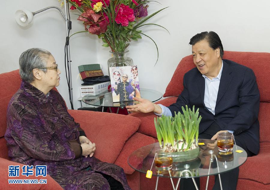 1月26日下午和27日上午,中共中央政治局常委、中央書記處書記劉云山代表習近平總書記和黨中央看望文化界知名人士,向他們致以誠摯問候,向廣大文化工作者致以新春祝福。這是1月27日,劉云山看望中國文聯榮譽委員、著名京劇表演藝術家李世濟。 新華社記者黃敬文攝