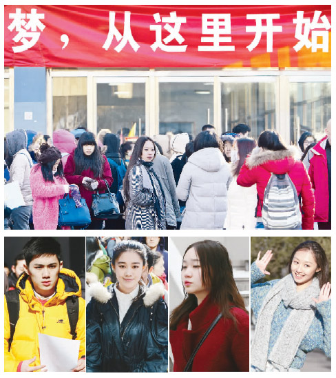 春節假期剛過, 2014年高校藝考就熱熱鬧鬧地開始了。中央戲劇學院、中國傳媒大學、北京電影學院三大藝術院校的報考依舊火熱,場面壯觀。來自全國各地的俊男靚女追夢的熱情遠遠蓋過了雪后的寒冷,溫臺詞、秀才藝的身影閃現于三大校園,他們的明星夢、藝術夢也從這里開始了。圖為參加藝考的考生。趙冰 胡慶明 韓海丹 攝