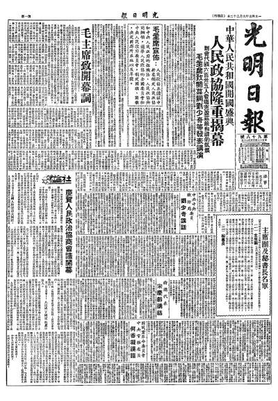 1949年9月21日,中國人民政治協(xié)商會議第一屆全體會議舉行。這是第二天出版的光明日報。 資料圖片