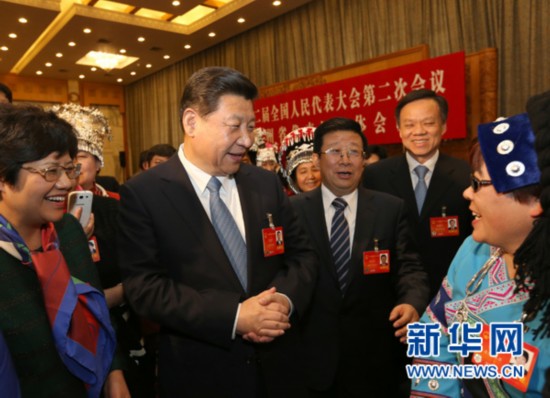 3月7日,中共中央總書記、國家主席、中央軍委主席習(xí)近平參加十二屆全國人大二次會議貴州代表團(tuán)的審議。這是習(xí)近平來到女代表中間,同她們親切交流,并表示,明天就是國際勞動婦女節(jié),借此機(jī)會,代表黨中央、國務(wù)院,向女代表、女委員及全國各界婦女同胞,致以節(jié)日的問候。新華社記者劉衛(wèi)兵攝